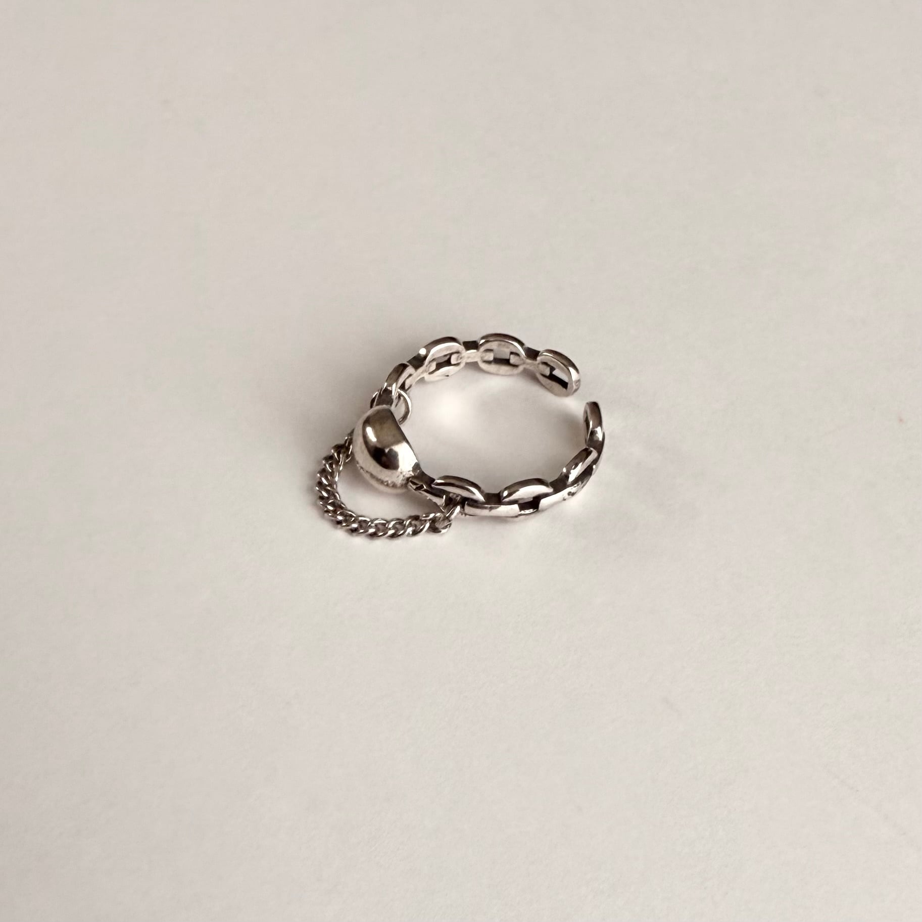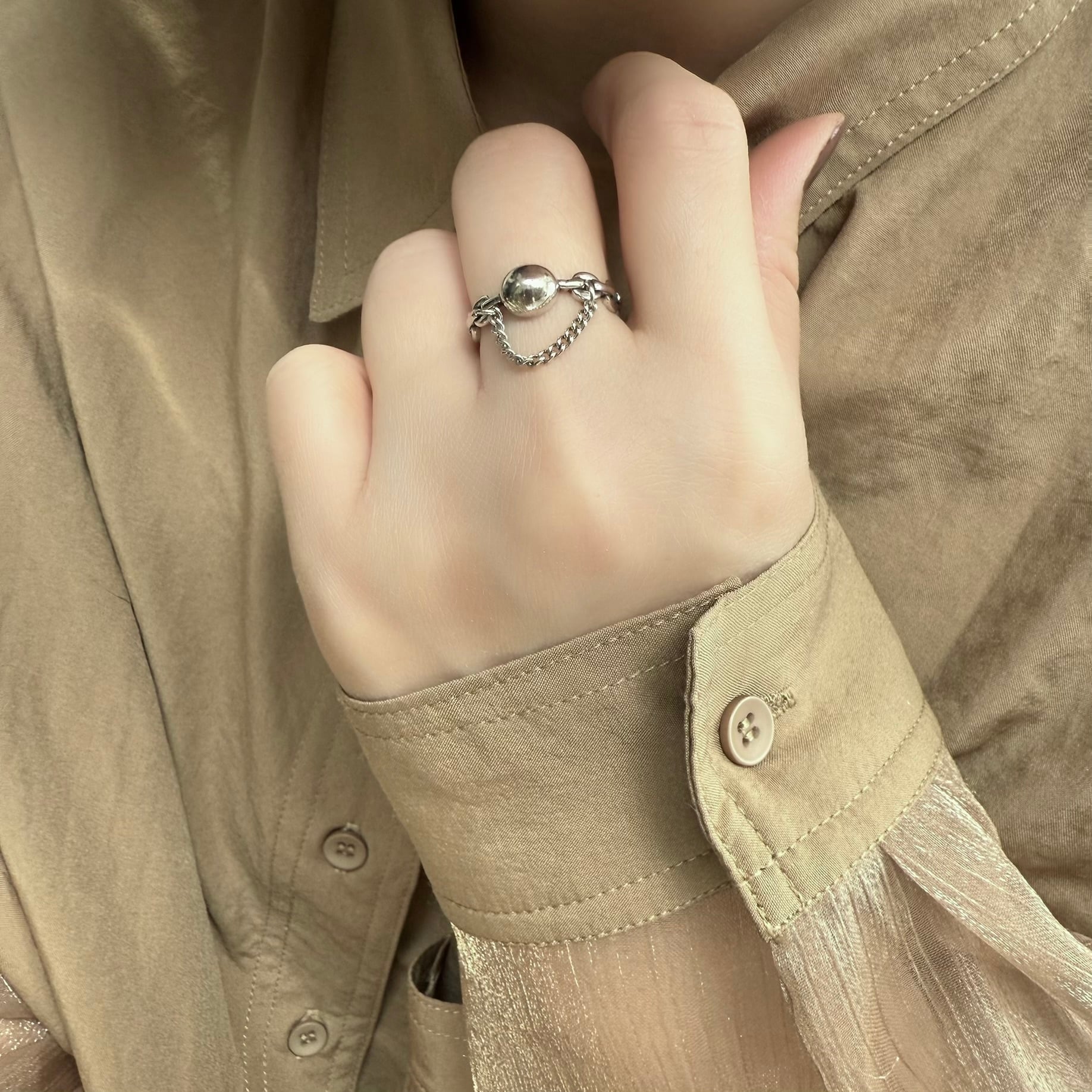 揺れるボールチェーンが印象的なリングで、動くたびに目を引き手元が華やかに。